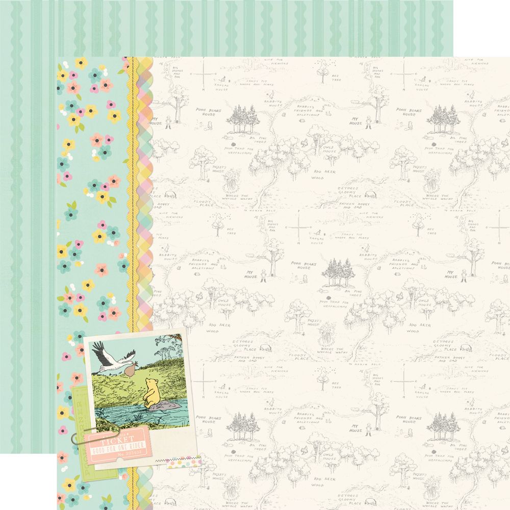 This 12x12 double-sided Designer Paper has a Border on one side with a Map on the frontside. The reverse side has Patterned Lines with a Mist Green background. Part of the Say Cheese Classic Pooh Bear by Simple Stories. Look for coordinating Products & Papers.